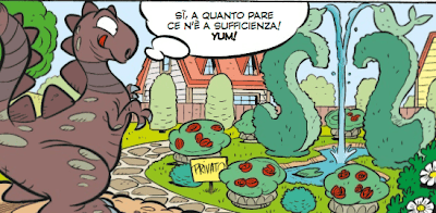 Chi l’avrebbe detto? Uno dei vicini di Archimede o è un appassionato di topiaria o ha speso dei soldoni per farsi curare il giardino da un maestro di topiaria. Fatto sta che in esso si possono ammirare due bei cespugli, alti, lavorati a S; sono posti uno dirimpetto all’altro, così da formare una specie di arco, “chiuso” idealmente dai due getti d’acqua incrociati che fuoriescono dalle “creste” a forma di pesce delle due sculture vegetali. In mezzo ad esse scorre un ruscelletto, ed è qui che l’acqua sprizzante dalle due cime, dopo aver formato un delta, alla fine si riversa.
