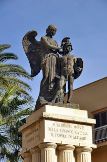Vediamo Vittorie dominare bianchi piedistalli in perfetta solitudine, o altre che, come si vede il più delle volte, incoronano eroi pronti al martirio o che hanno già trovato la gloria. Una variazione di questa seconda tipologia è il monumento ai Caduti di Alcamo, il comune del Trapanese che diede i natali a Ciullo, raffinato poeta della scuola di Federico II.