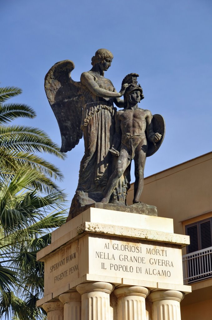 Vediamo Vittorie dominare bianchi piedistalli in perfetta solitudine, o altre che, come si vede il più delle volte, incoronano eroi pronti al martirio o che hanno già trovato la gloria. Una variazione di questa seconda tipologia è il monumento ai Caduti di Alcamo, il comune del Trapanese che diede i natali a Ciullo, raffinato poeta della scuola di Federico II.