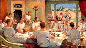 Come per i Greci, anche per i Romani la coena era il pasto principale: la precedevano nell’arco della giornata lo ieientaculum (o ientaculum) e il prandium, più frugali. Anche la coena, in origine, seppur più ricca, non era particolarmente sfarzosa: sarà l’influenza dei costumi greci a farne un rito distintivo dei ricchi nelle tre fasi della gustatio(l’antipasto), dei fercula (la cena vera e propria) e dei tragemata (i dessert). Nell’intervallo tra un momento di refezione e un altro gli schiavi della casa, che il padrone distribuiva ad inizio pasto tra i vari convitati perché si prendessero cura di essi in ogni istante della serata, potevano lavare loro i piedi o comunque espletare mansioni relative alla loro igiene (in fig.).