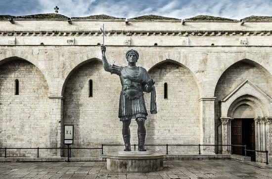 È fuor di dubbio che ormai quanto all’origine del colosso di Barletta ci sono due piste: la pista costantinopolitana e quella ravennate. La prima è la più conforme alla tradizione, che vuole la statua trasportata in Occidente dai veneziani dopo il sacco di Costantinopoli del 1204 e abbandonata sulla spiaggia di Barletta. La seconda è frutto di più recenti studi, e metterebbe in collegamento la presenza della statua nella città pugliese con alcuni scavi proto-archeologici messi in atto da Federico II di Svevia a Ravenna, ultima capitale dell’impero romano d’Occidente e poi capitale dell’esarcato bizantino. Perché poi sia stata collocata proprio a Barletta e non in un altro punto della Puglia o del Mezzogiorno questo non è dato saperlo (Federico II, grande meridionalista, cercò di garantire un tesoro praticamente a tutte le città del suo regno, ma questo risponde solo blandamente alla nostra domanda; chi invece è convinto della provenienza della statua da Costantinopoli ha già una spiegazione). Bizantino è la parola-chiave per quanto riguarda il colosso, visto che di statua bizantina si tratterebbe o per l’identificazione del personaggio (uno degli imperatori della dinastia teodosiana) o per la fattura stessa della statua (se si dà per buona, naturalmente, la pista costantinopolitana, ma nulla esclude, comunque, che un maestro bizantino abbia potuto operare a Ravenna).